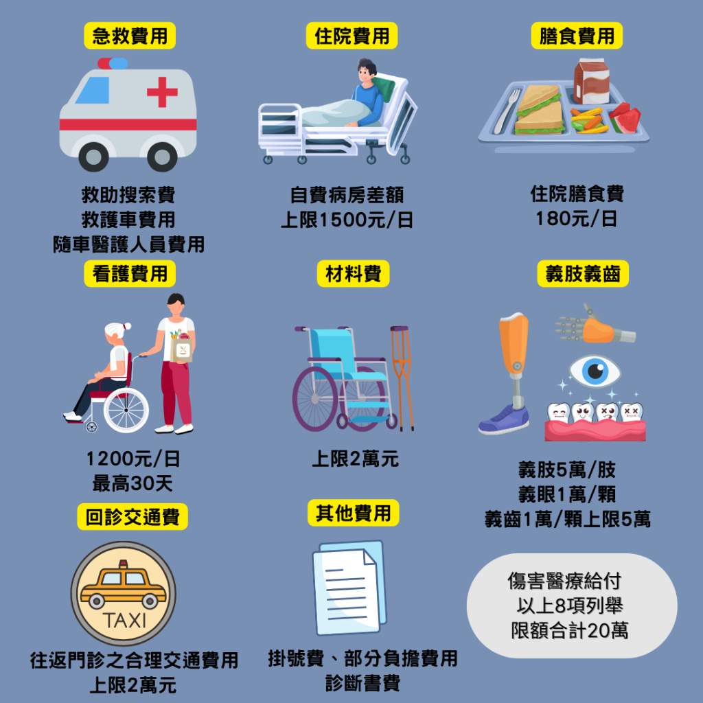 - 傷害醫療費用:列舉式限額給付,非實支實付,共新台幣20萬