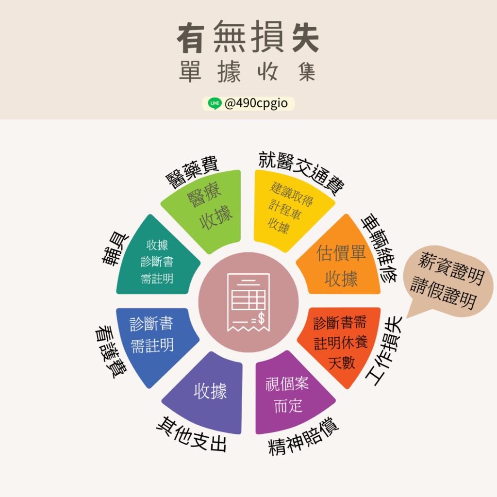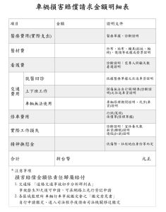 - 車輛維修費用或其他財物損壞:需有維修估價單或購賣憑證