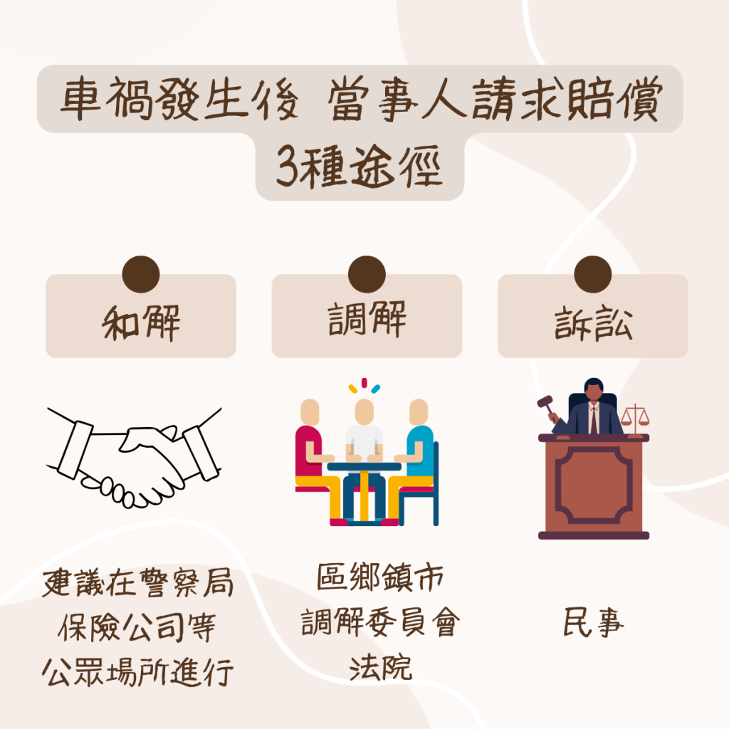 針對小額賠償或雙方沒爭議案件適用,建議在警局或是保險公司等公眾場所 - 調解:
