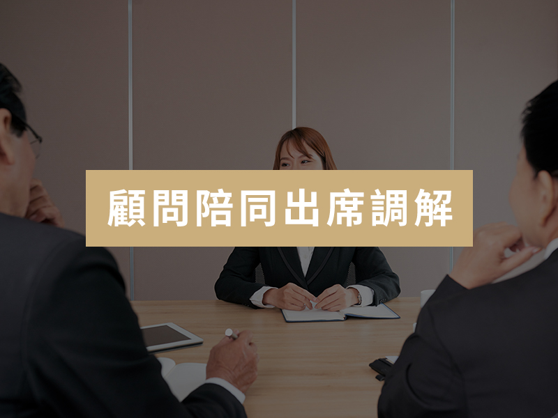 陪同調解:需提早告知調解日期、時間、地點,與顧問確定行程後,由專業顧問陪同調解,現場與對方或保險公司進行溝通協調、談判。